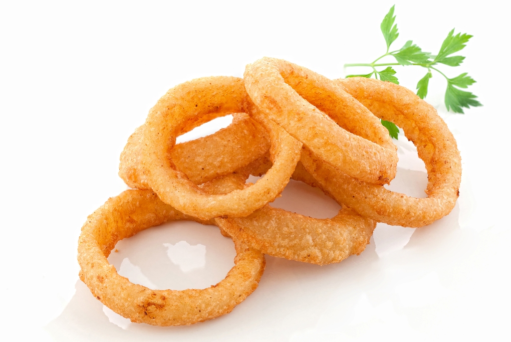 Anillos de cebolla triturada, empanados, prefritos y ultracongelados.