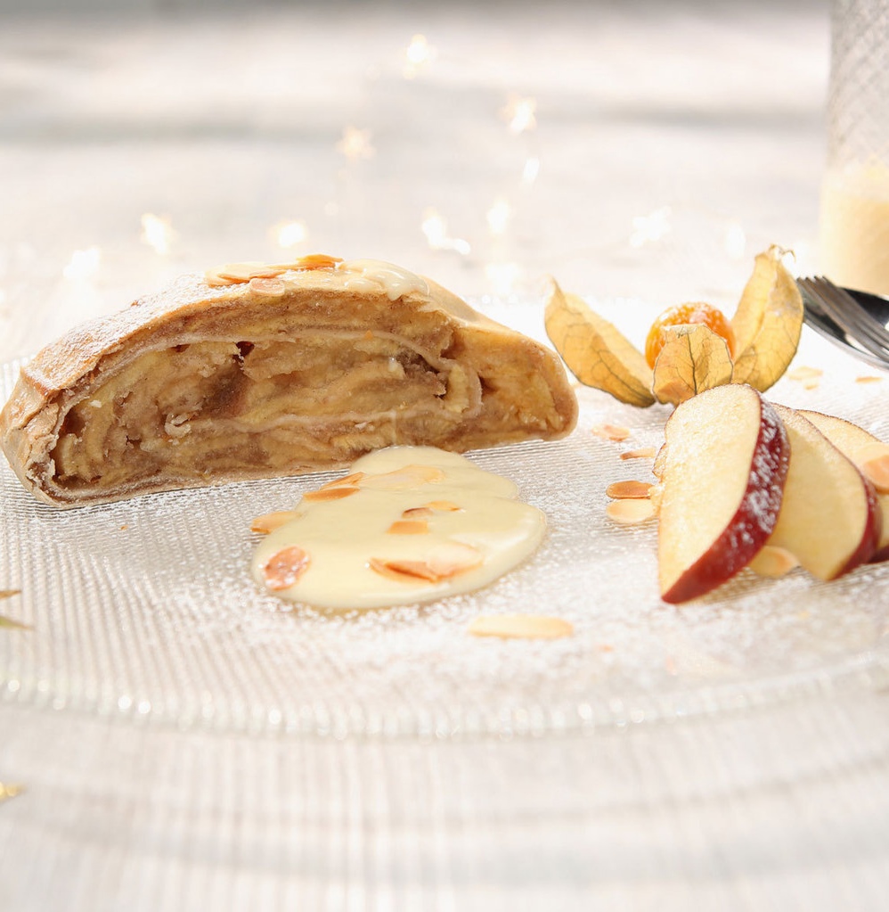 Clásico postre Alemán a base de hojaldre relleno de trozos de manzana, pasas, y un toque de canela. Calentar y consumir.