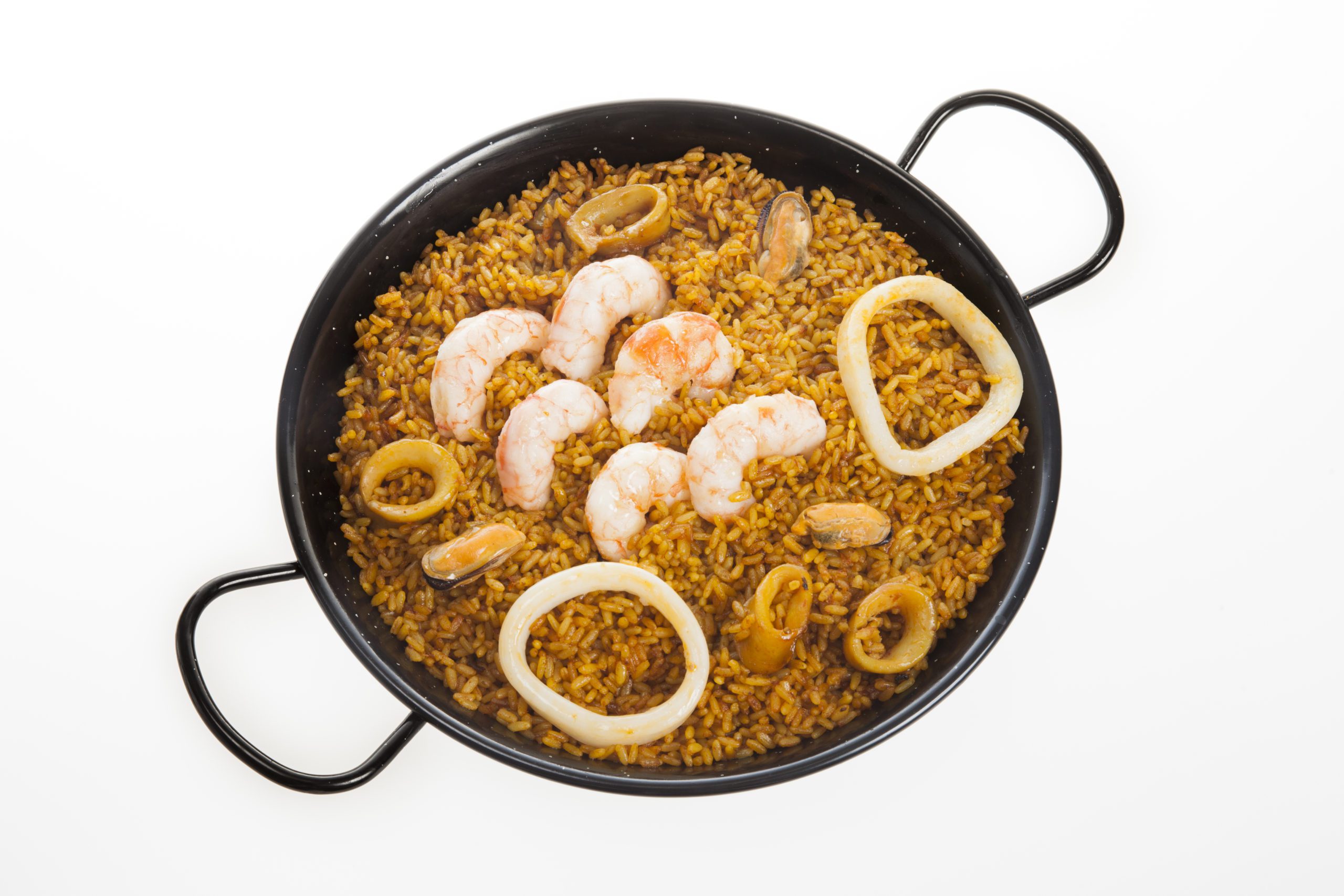 a base de Arroz, gambón pelado, calamar, mejillón.