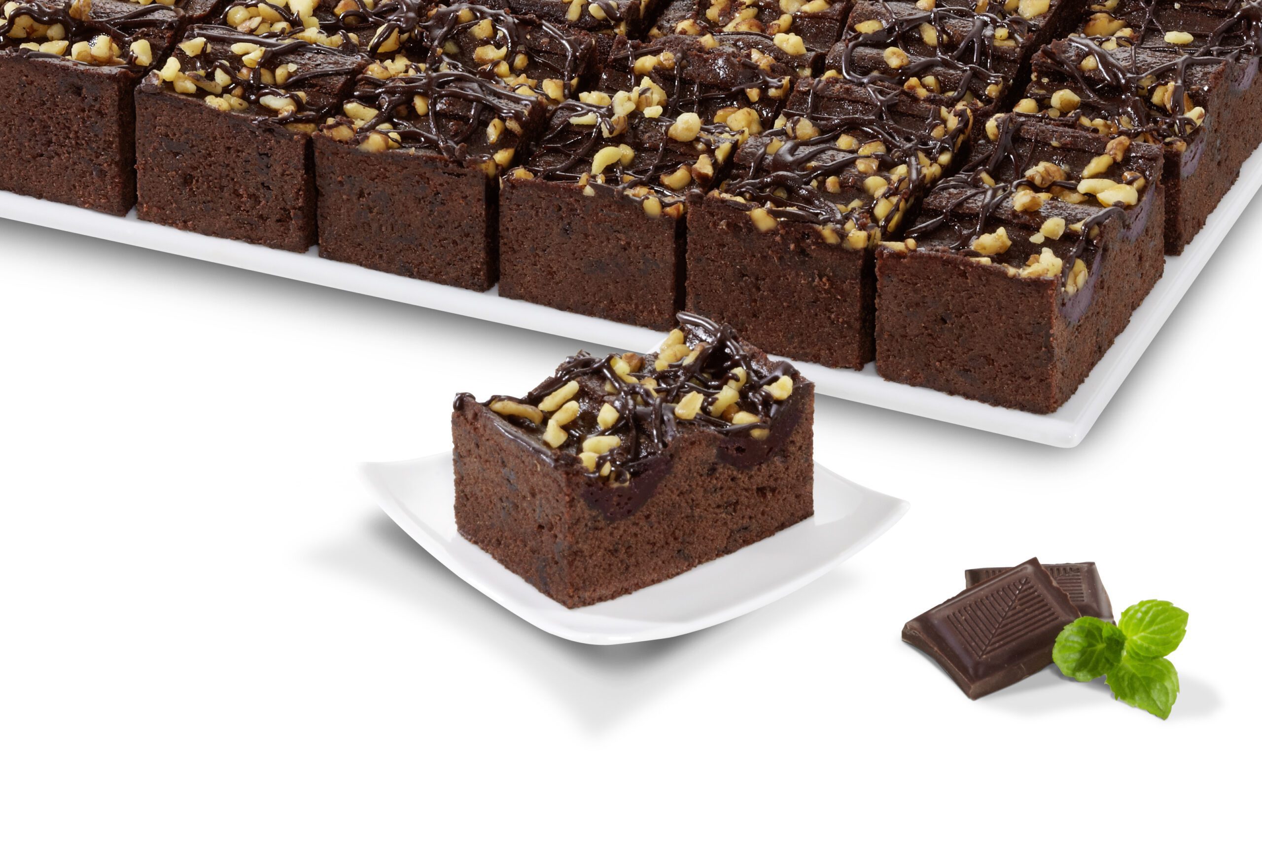 Una base de bizcocho oscuro cubierto por una deliciosa crema de chocolate. Decorado con trozos de nueces y virutas oscuras.