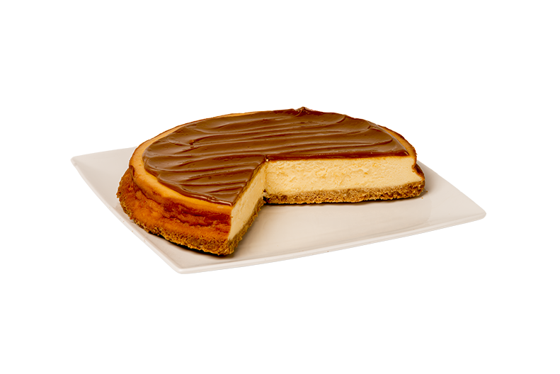 Tarta horneada con base de galleta digestive, de crema de queso y decorada con dulce de leche.
