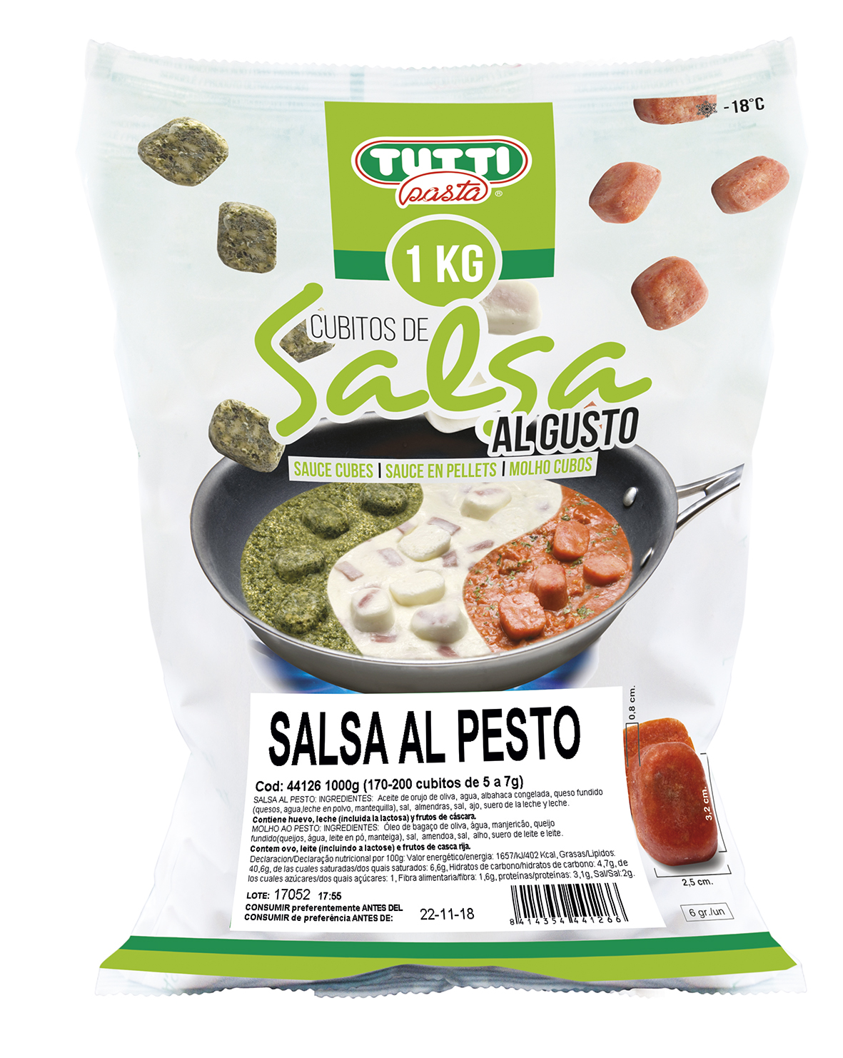 Salsa tradicional italiana, a base de albahaca, aceite de oliva, queso y almendras. En forma de cubitos.