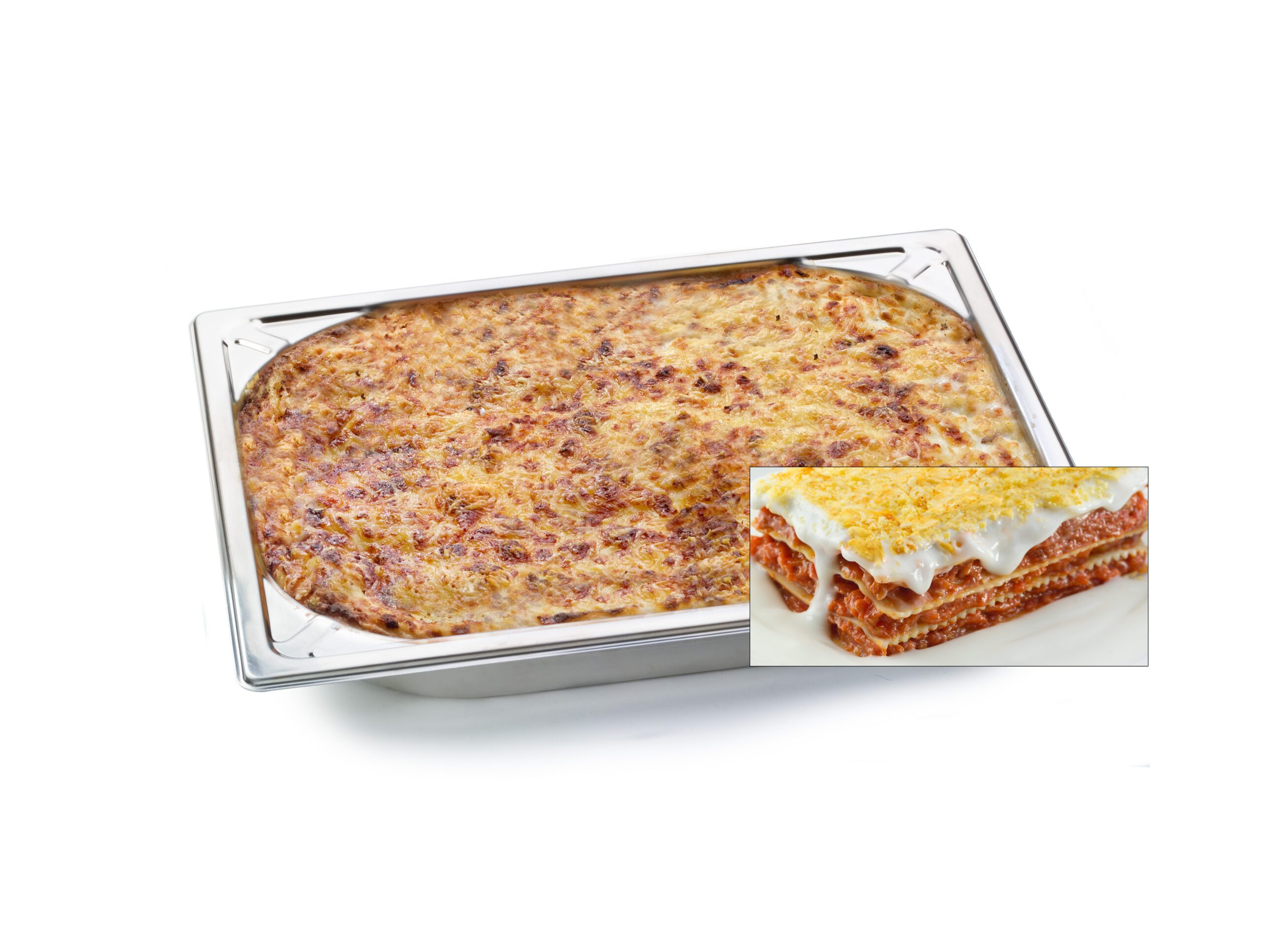 Finas láminas de pasta con un jugoso relleno de carne ternera 100%,todo cubierto de cremosa bechamel y crujiente queso gratinado en formato grande
