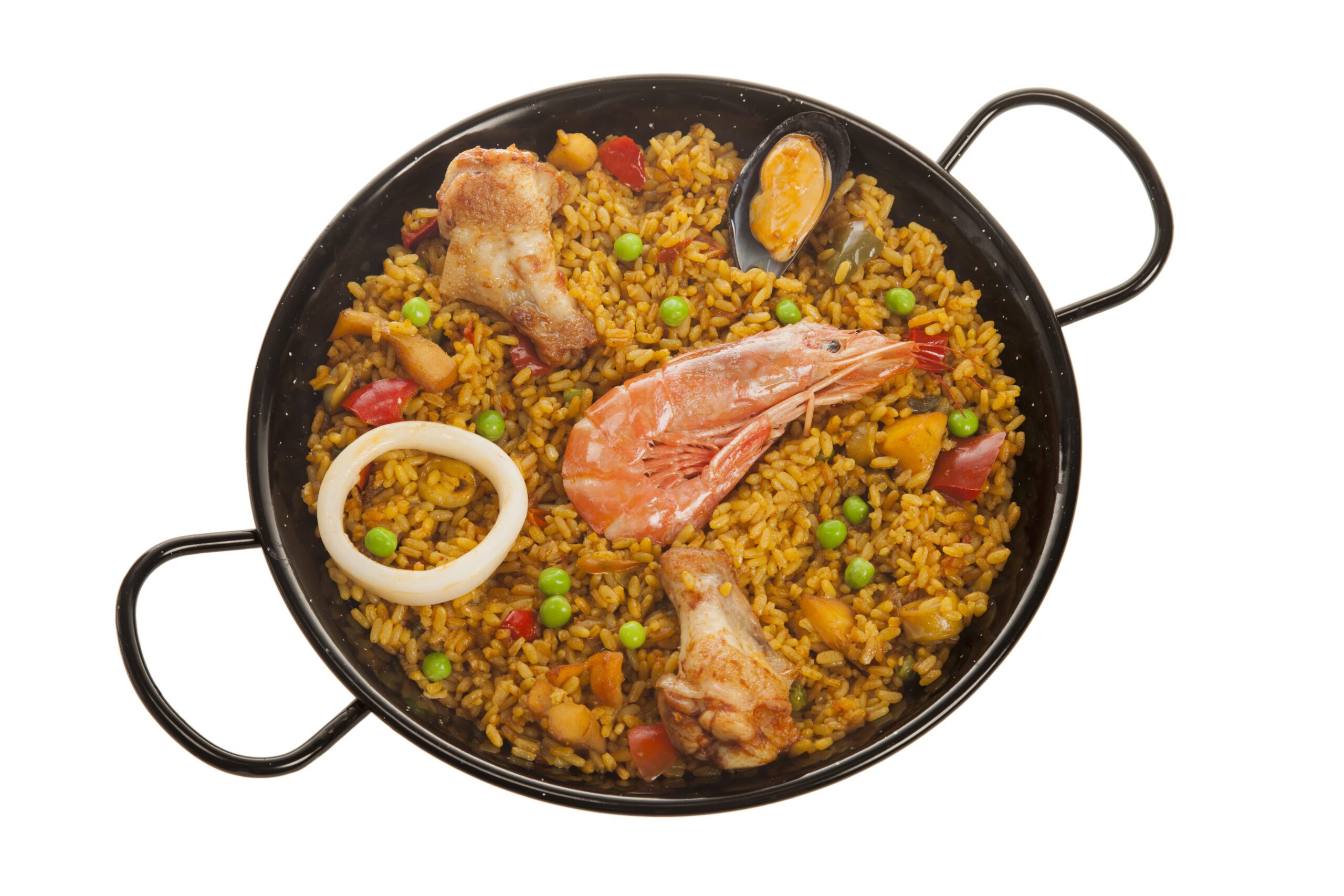 a base de Arroz, pollo, gambón, calamar, mejillón, pimiento y guisantes.