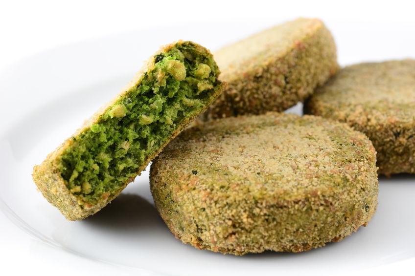 Hamburguesa vegana a base de habas y espinacas, empanada.