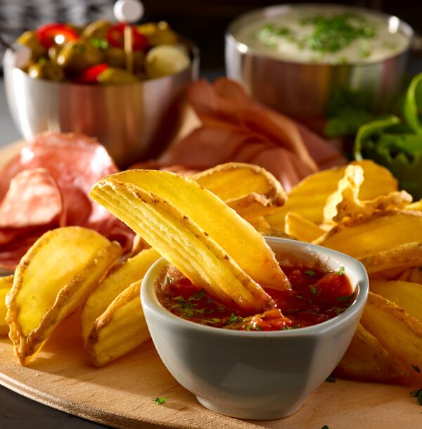 Patata con piel en corte V, recubiertos de un crujiente rebozado. Prefritos y ultracongelados.