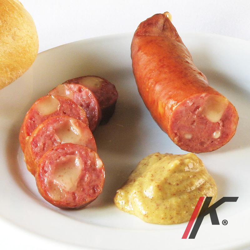 Receta tradicional de la salchicha austriaca con ahumado natural de madera de Haya, queso emmental en su interior y con tripa natural.