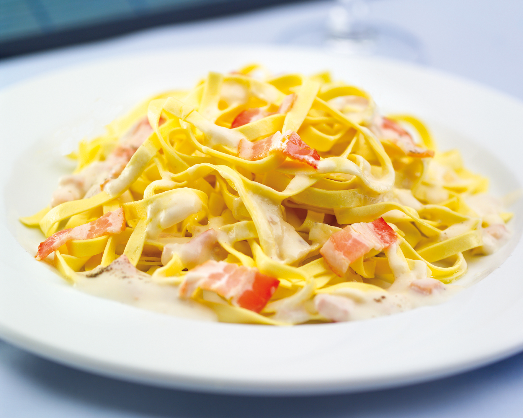 La cremosa salsa carbonara con trocitos de bacon ahumado y un suave toque de pimienta negra, acompañando a los famosos tallarines.