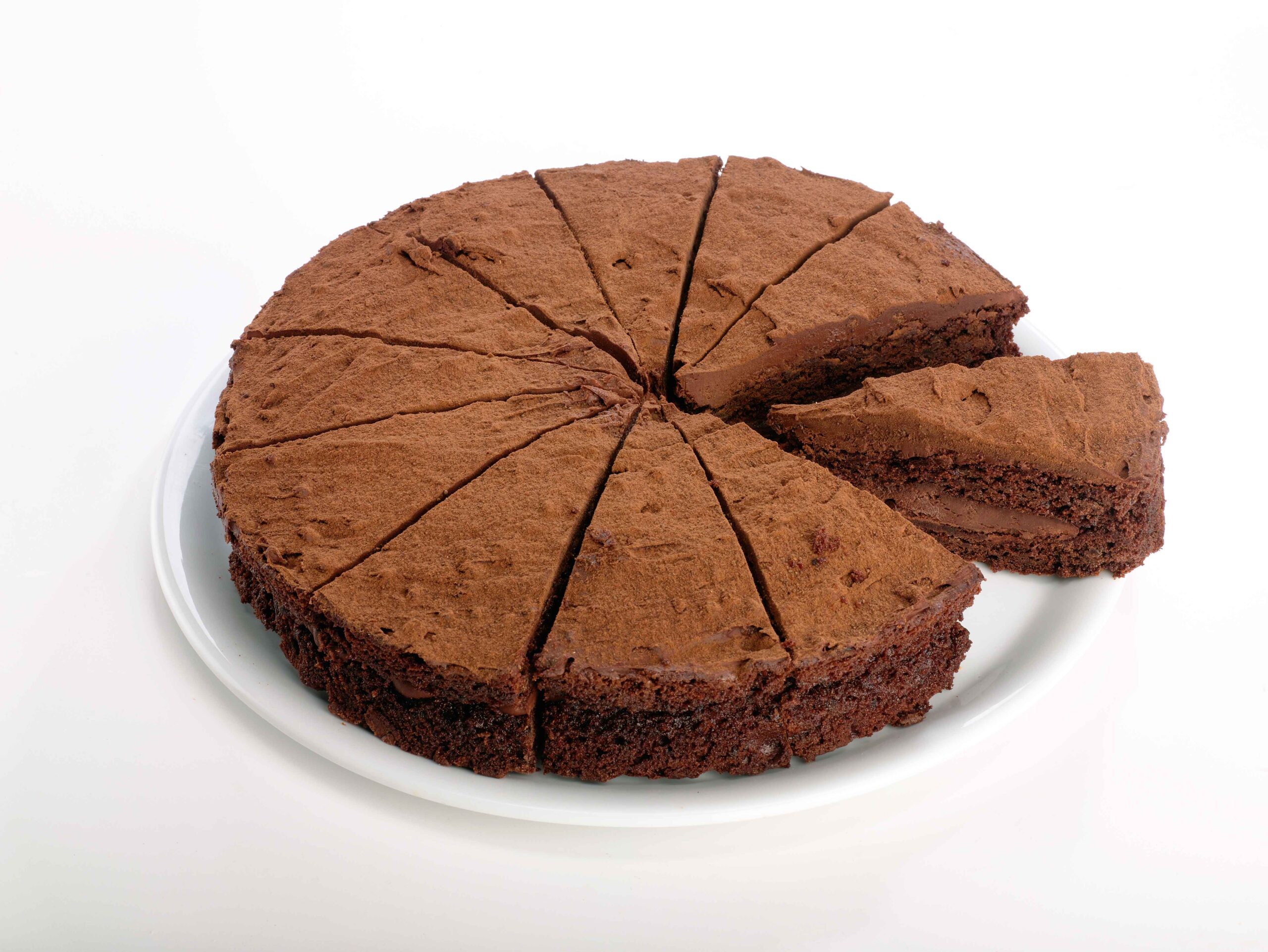 Dulce bizcocho de chocolate relleno de crema de chocolate. Cubierto con un recubrimiento con cacao y decorado con crema de turrón.