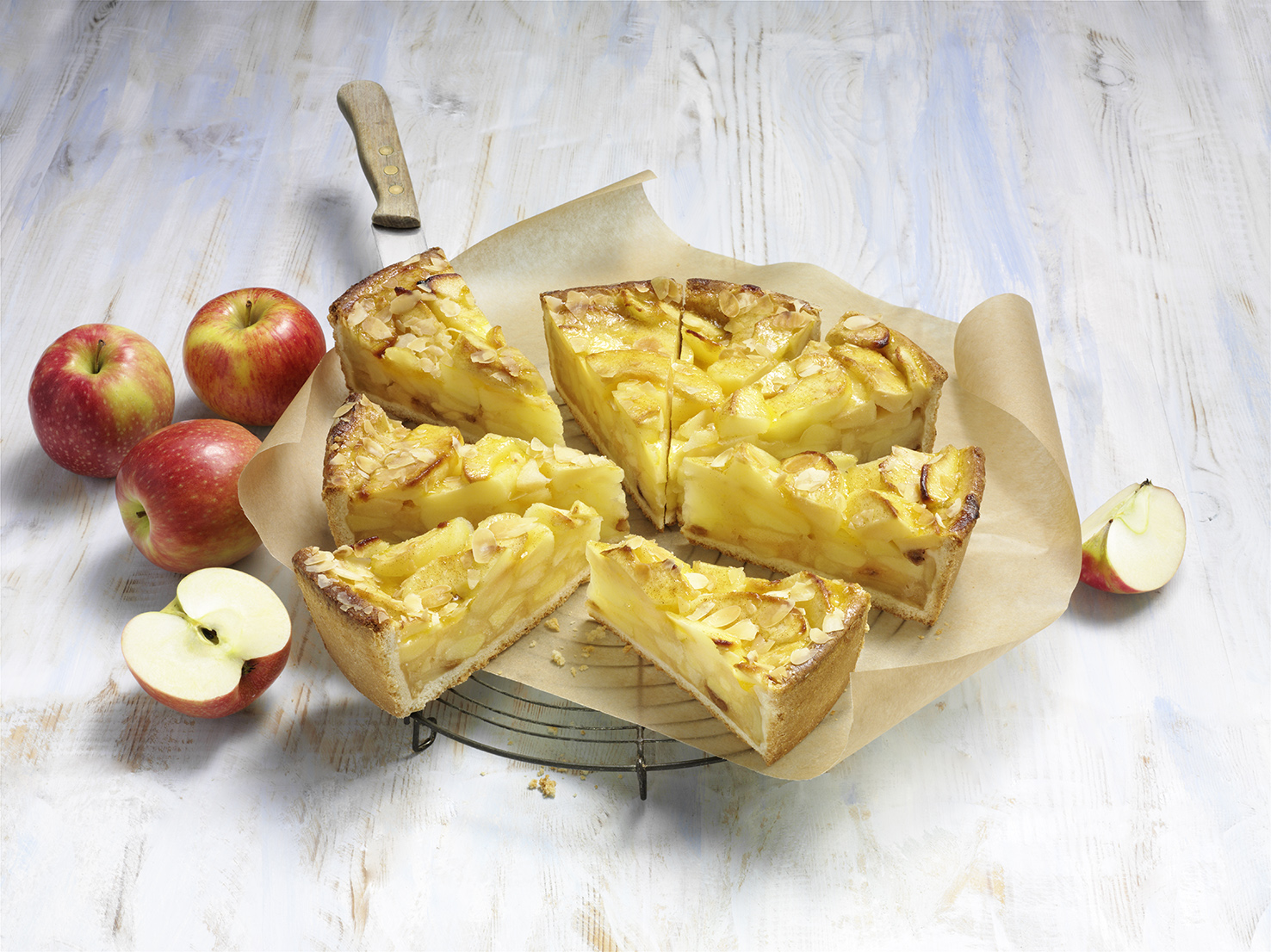 Tarta de manzana estilo casero con trozos enteros de manzana y almendras laminadas, sobre una crujiente base de masa quebrada.